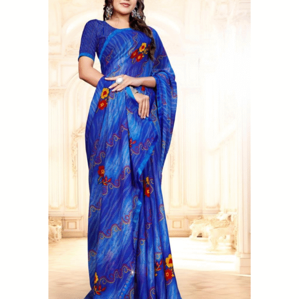 Elegant royal blue saree with vibrant leaf motifs, perfect for festive and traditional occasions. Comes with a matching blouse piece. Available in multiple colors.