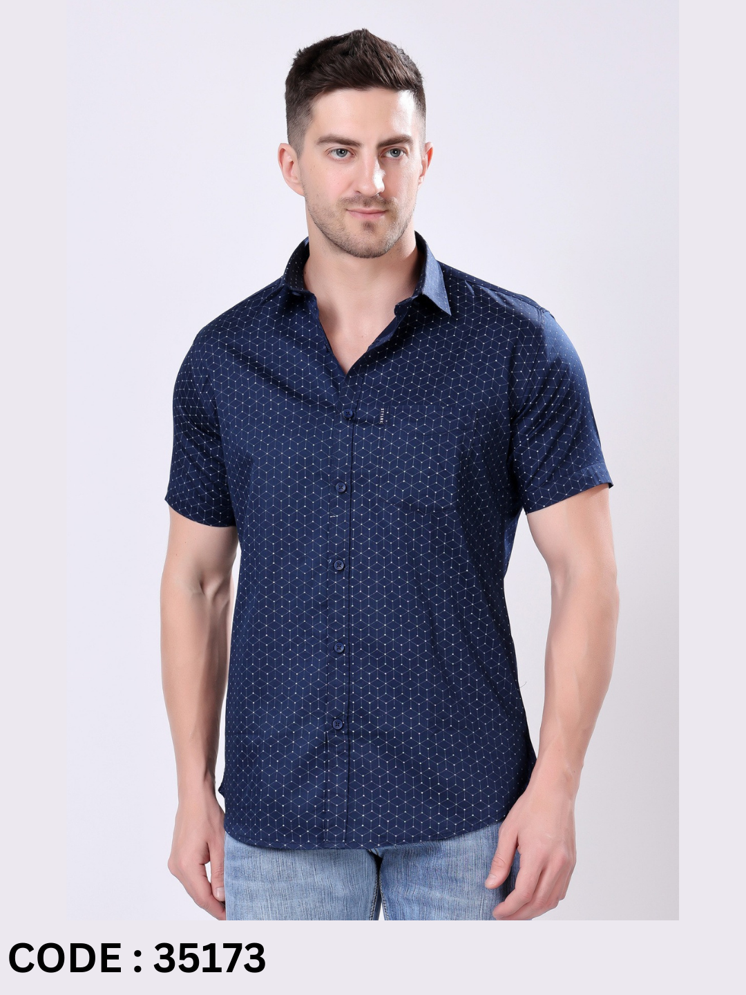 Step up your style with this classic navy-blue casual shirt featuring a subtle geometric print.