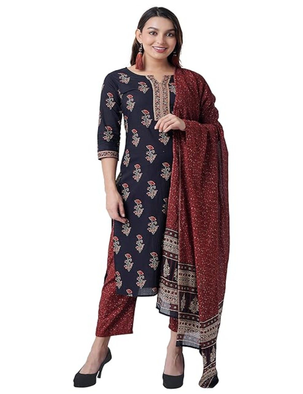 Intricate Ethnic Print: The kurta in this set features a beautiful ethnic print that is inspired by traditional Indian patterns. The intricate design is eye-catching and adds an extra touch of elegance to the overall look.